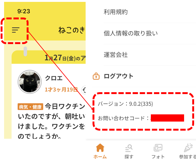 ※アプリ左上のメニューをタップいただき、下部の赤枠部分に記載されています。